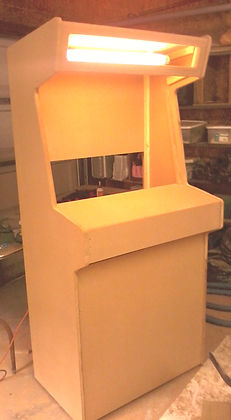 The prototype Arcade Master was built around the dimensions of a 32" LCD television (about half the price of a traditional arcade monitor), while also making sure the side panels could be cut from a single sheet (rather than 2) of MDF (medium density fiberboard, the material shown under construction at right). This approach of lower cost components that are just as functional as traditional components was central to the Nurmweb Games approach: keeping costs down but still getting the desired end product.